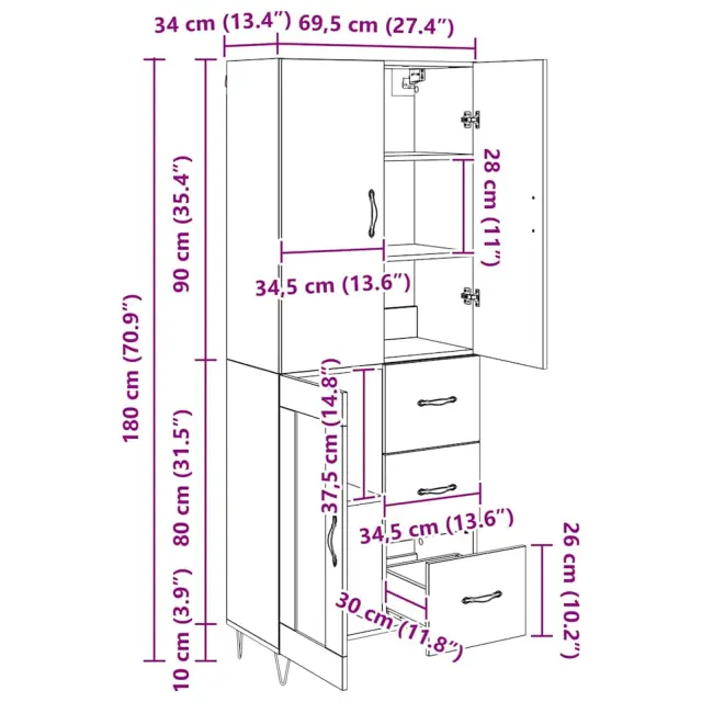 vidaXL Visok predalnik 2 pcs Star les Inženirski les in steklo