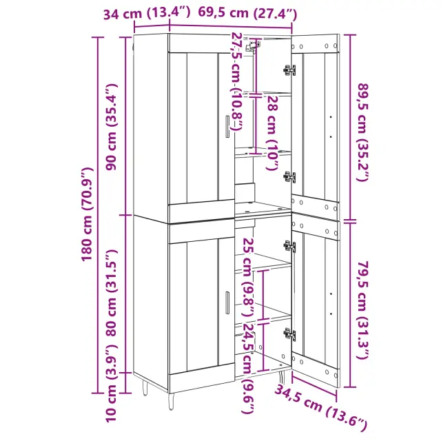 vidaXL Visok predalnik 2 pcs Star les Inženirski les in steklo