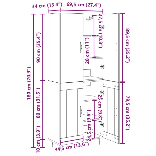 vidaXL Visok predalnik 2 pcs Star les Inženirski les in steklo