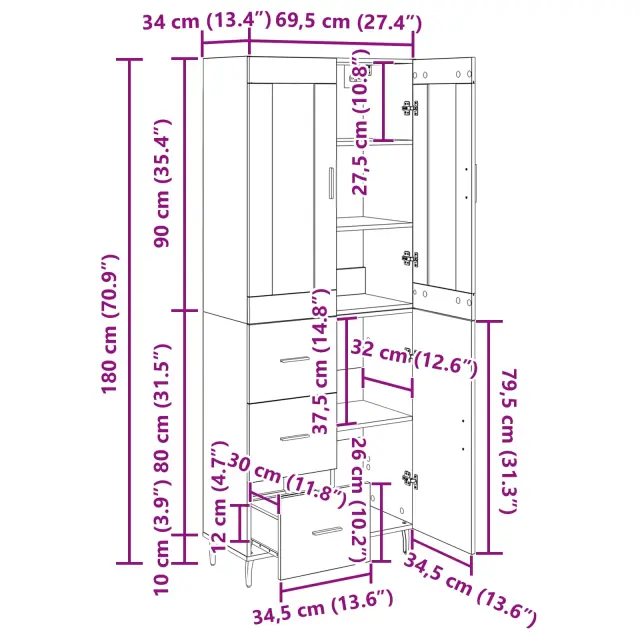 • 1 x Vrh za visok omarico: 69,5 x 34 x 90 cm (D x Š x V)