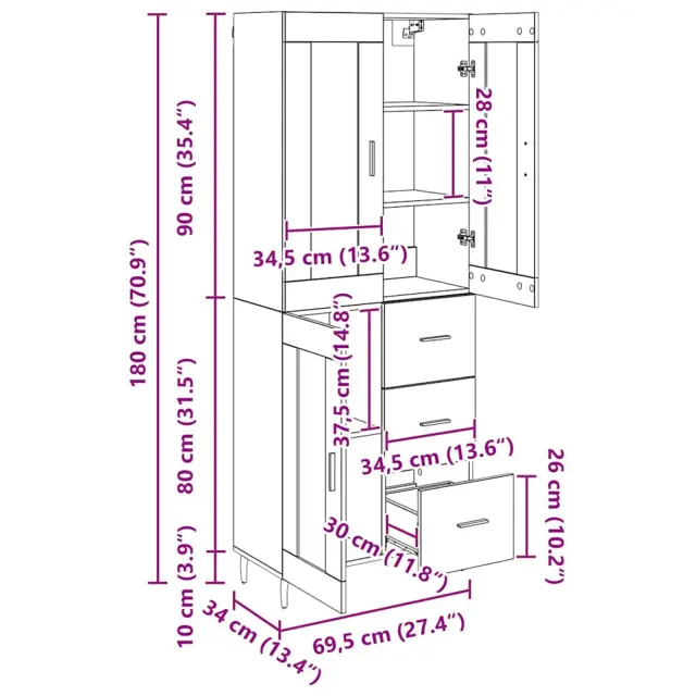 vidaXL Visok predalnik 2 pcs Umetni hrast Inženirski les in steklo