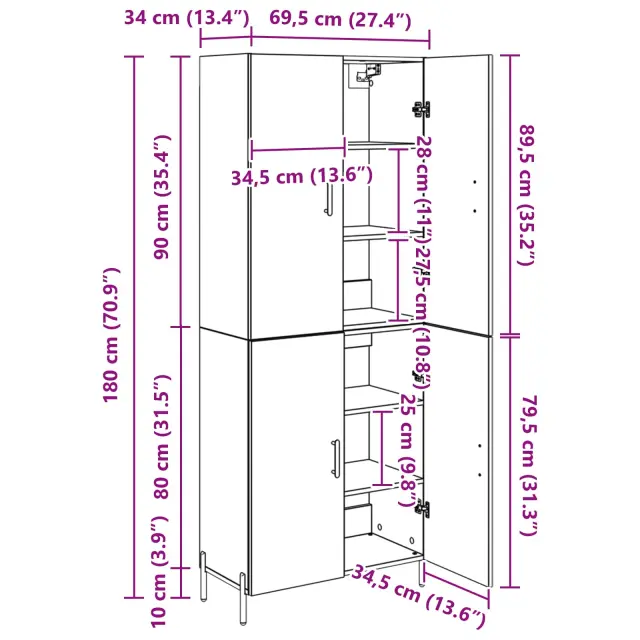 vidaXL Visok predalnik Črna Orehovina 69,5 x 34 x 180 cm