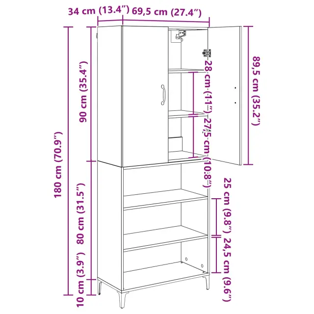 vidaXL Visok predalnik Črna Orehovina 69,5 x 34 x 180 cm