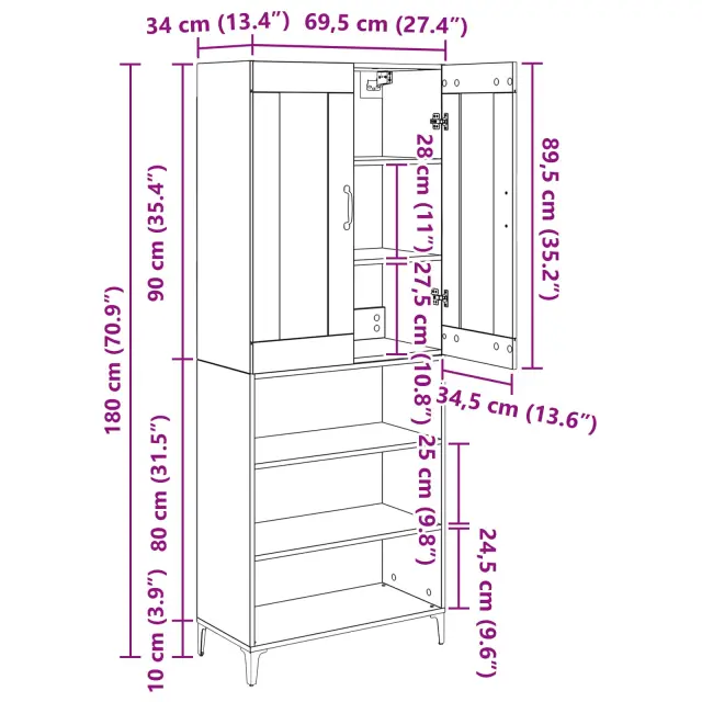 vidaXL Visok predalnik Črna Orehovina 69,5 x 34 x 180 cm