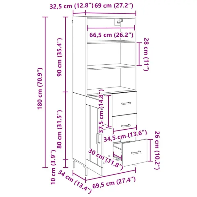vidaXL Visok predalnik s predalom Črna Orehovina 69,5 x 34 x 180 cm