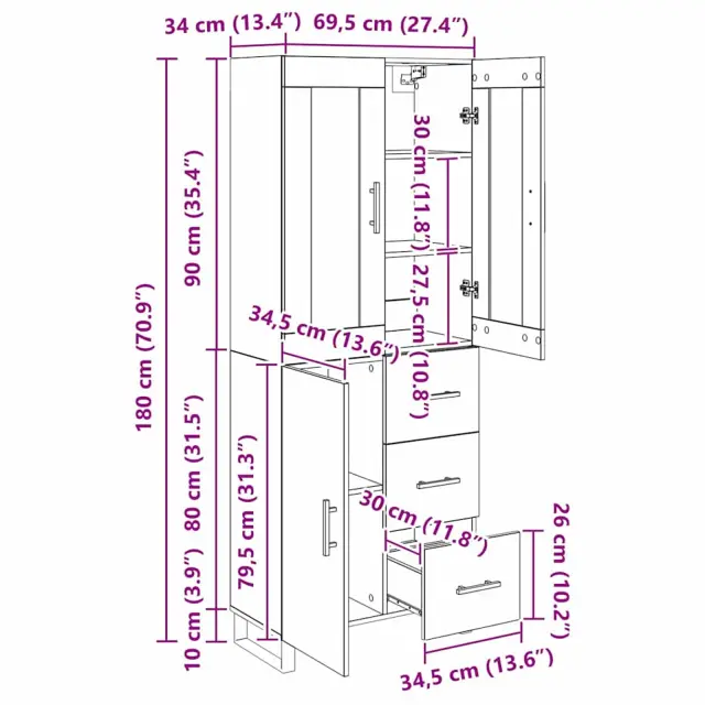 vidaXL Visok predalnik s predalom Črna Orehovina 69,5 x 34 x 180 cm
