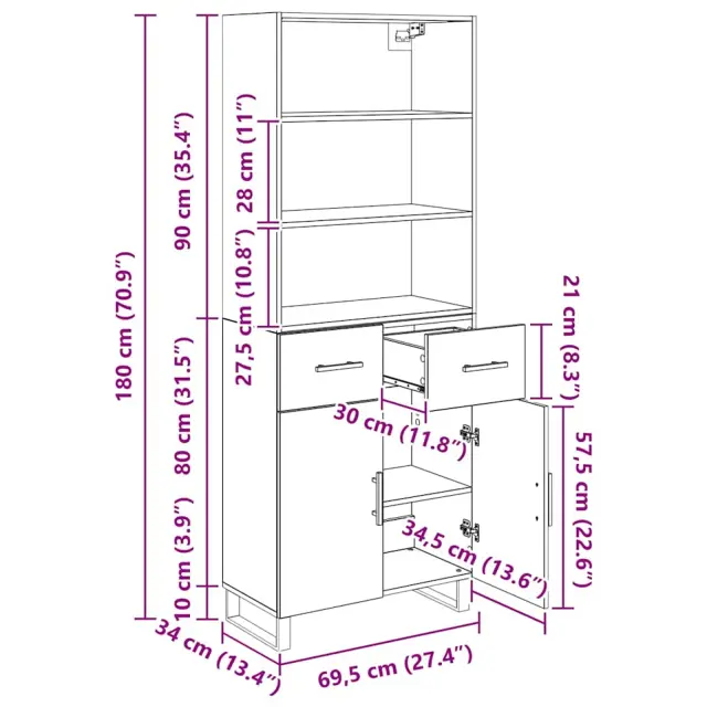 vidaXL Visok predalnik s predalom Črna Orehovina 69,5 x 34 x 180 cm