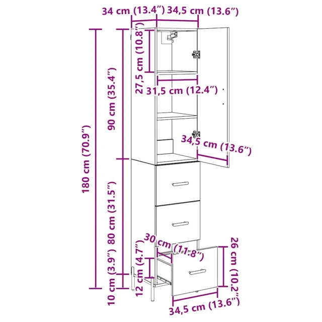 vidaXL Visok predalnik s predalom Črna Orehovina 34,5 x 34 x 180 cm