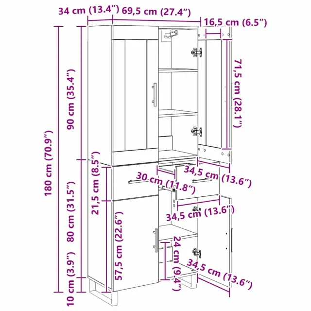 vidaXL Visok predalnik s predalom Črna Orehovina 69,5 x 34 x 180 cm