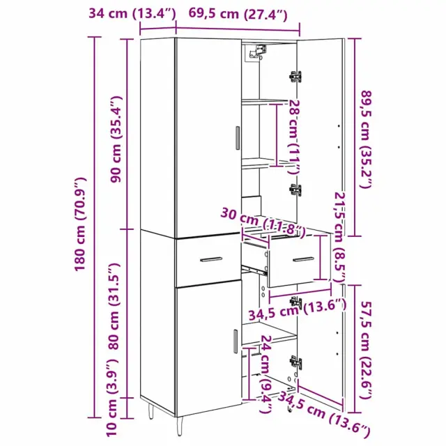 vidaXL Visok predalnik s predalom Črni hrast 69,5 x 34 x 180 cm