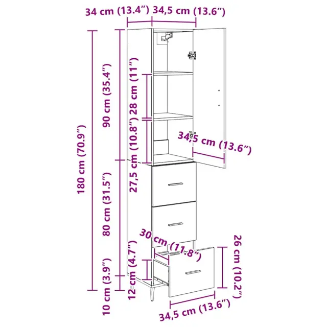 vidaXL Visok predalnik Umetni hrast 34,5 x 34 x 180 cm Konstruiran les