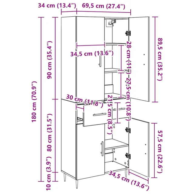 vidaXL Visok predalnik Umetni hrast 69,5 x 34 x 180 cm Konstruiran les