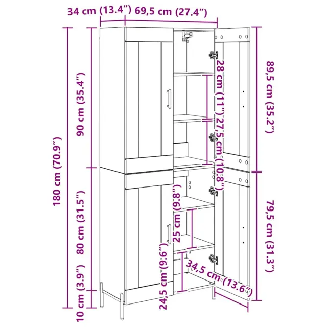 vidaXL Visok predalnik Umetni hrast 69,5 x 34 x 180 cm Konstruiran les