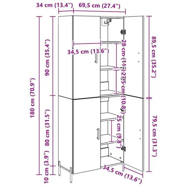 vidaXL Visok predalnik Umetni hrast 69,5 x 34 x 180 cm Konstruiran les