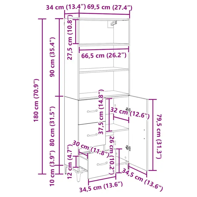 vidaXL Visok predalnik Umetni hrast 69,5 x 34 x 180 cm Konstruiran les