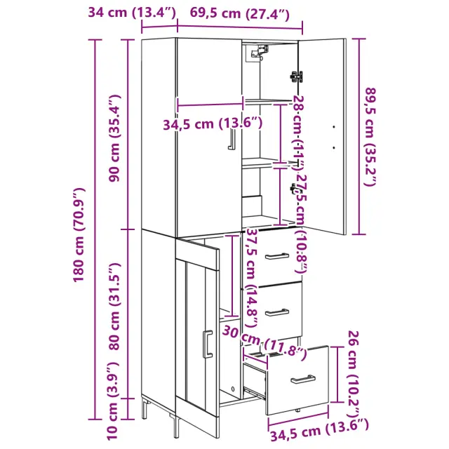 vidaXL Visok predalnik Umetni hrast 69,5 x 34 x 180 cm Konstruiran les