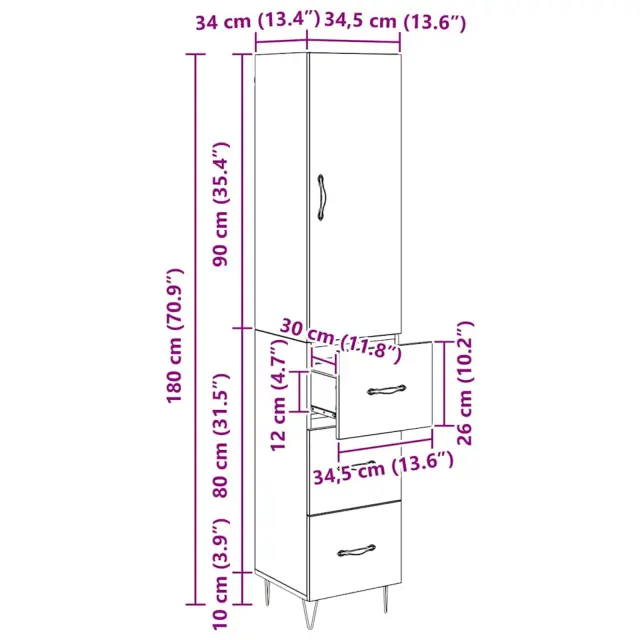 vidaXL Visok predalnik Umetni hrast 69,5 x 34 x 180 cm Konstruiran les