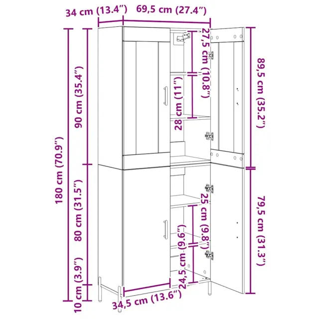 vidaXL Visok predalnik Umetni hrast 69,5 x 34 x 180 cm Konstruiran les