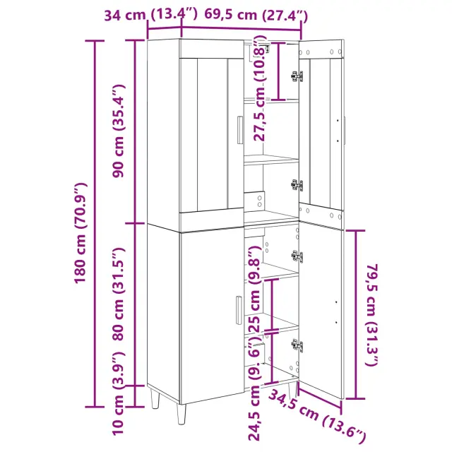 vidaXL Visok predalnik Umetni hrast 69,5 x 34 x 180 cm
