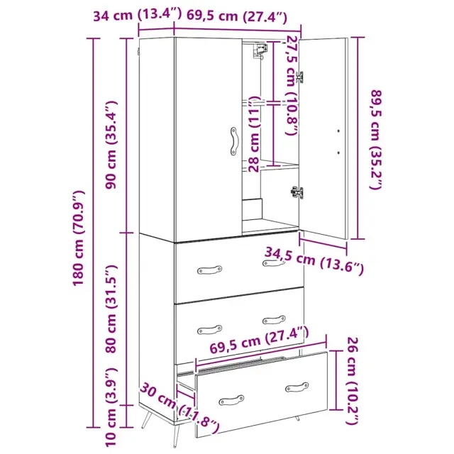 vidaXL Visok predalnik Umetni hrast 69,5 x 34 x 180 cm Konstruiran les