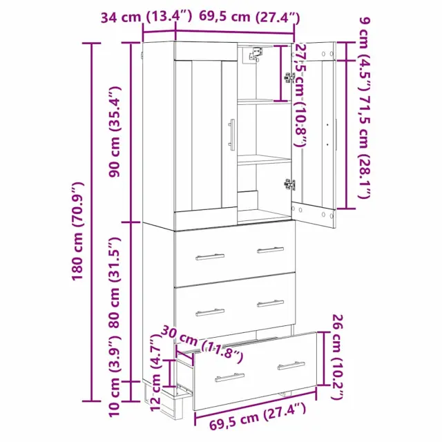 • 1 x vrh za visoko omaro: 69,5 x 34 x 90 cm (D x Š x V)