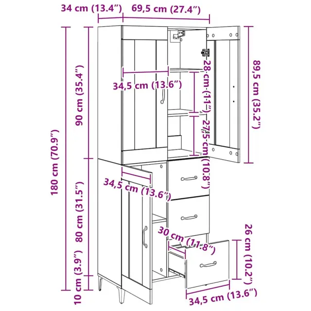 vidaXL Visok predalnik Umetni hrast 69,5 x 34 x 180 cm Konstruiran les