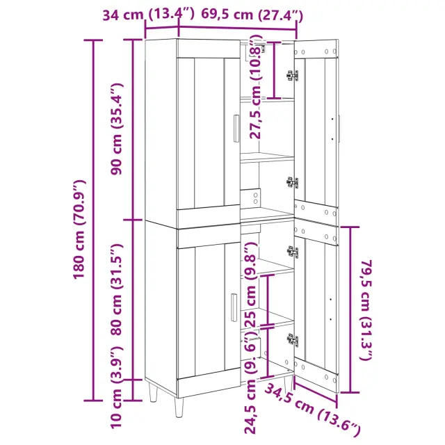 vidaXL Visok predalnik Umetni hrast 69,5 x 34 x 180 cm Konstruiran les
