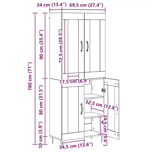 vidaXL Visok predalnik Umetni hrast 69,5 x 34 x 180 cm Konstruiran les