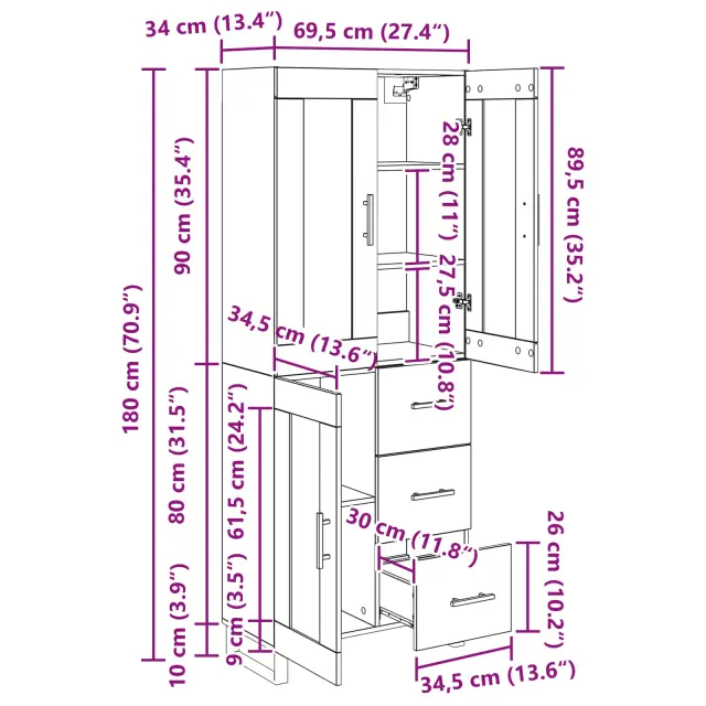 vidaXL Visok predalnik Umetni hrast 69,5 x 34 x 180 cm Konstruiran les