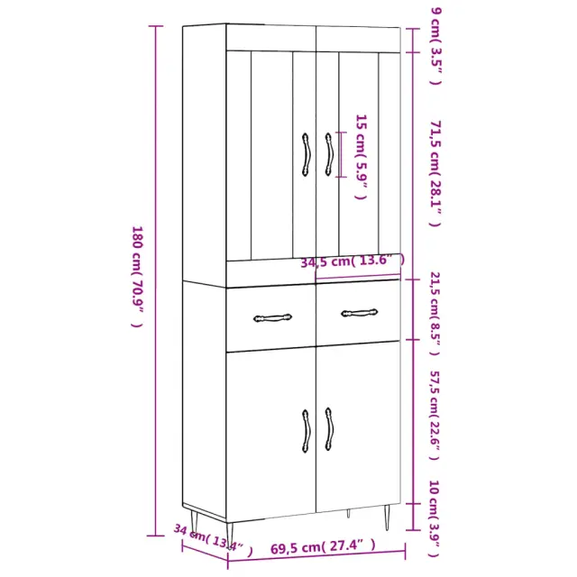 vidaXL Visoka komoda siva sonoma 69,5x34x180 cm inženirski les