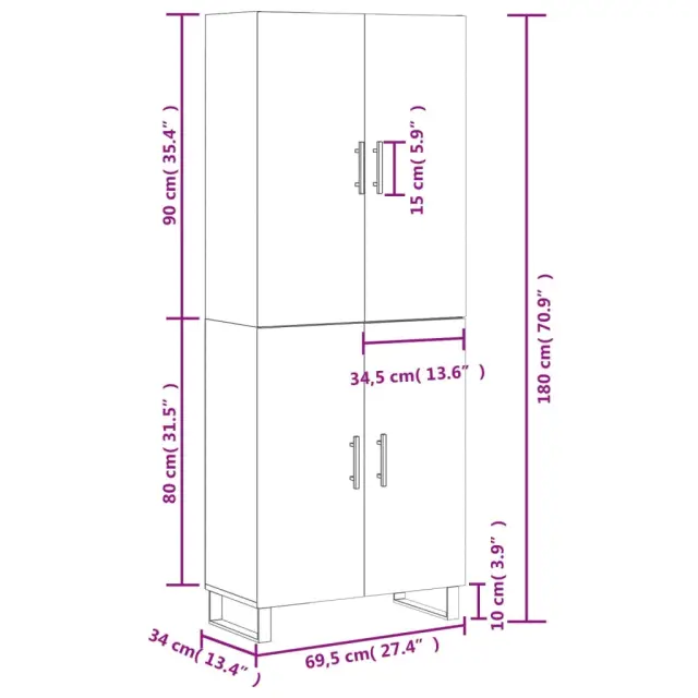 Ali iščete stilsko visoko omaro? Ta visoka komoda doda eleganten čar vašim notranjim prostorom! Vzdržljiv material: Inženirski les se ponaša z izjemno kakovostjo, gladko površino ter močjo, stabilnostjo in odpornostjo na vlago.Veliko prostora za shranjevanje: Omarica ponuja veliko prostora za shranjevanje različnih dnevnih potrebščin, da bodo lepo organizirane in na dosegu roke.Praktična vrata: Poskrbite, da bo vaš prostor urejen, tako da majhne stvari skrijete za vrata omare za shranjevanje.Kovinske noge: Kovinske noge dodajo vaši notranjosti umirjen slog, hkrati pa zagotavljajo stabilnost. Opozorilo:Za preprečitev prevračanja je treba ta izdelek uporabiti s priloženo napravo za pritrditev na steno. Dobro je vedeti:Vijaki in čepi za notranjost stene niso priloženi. Svetujemo vam, da poiščete in uporabite vijake in zatiče, ki so primerni za vaše stene. Če niste prepričani, se lahko posvetujete s strokovnjakom. Preberite in upoštevajte vse korake v navodilih.Barva: BelaMaterial: Inženirski les, kovinaSkupne dimenzije: 69,5 x 34 x 180 cm (Š x G x V)Dimenzije kredence: 69,5 x 34 x 90 cm (Š x G x V)Mere zgornje plošče: 69,5 x 34 x 90 cm (Š x G x V)Potrebno sestavljanje: DaPaket vsebuje:1 x Komoda1 x Zgornja omaricaLegal Documents:Več informacij o tem, kako preprečiti prevračanje pohištva, je na voljo tukaj 3195699