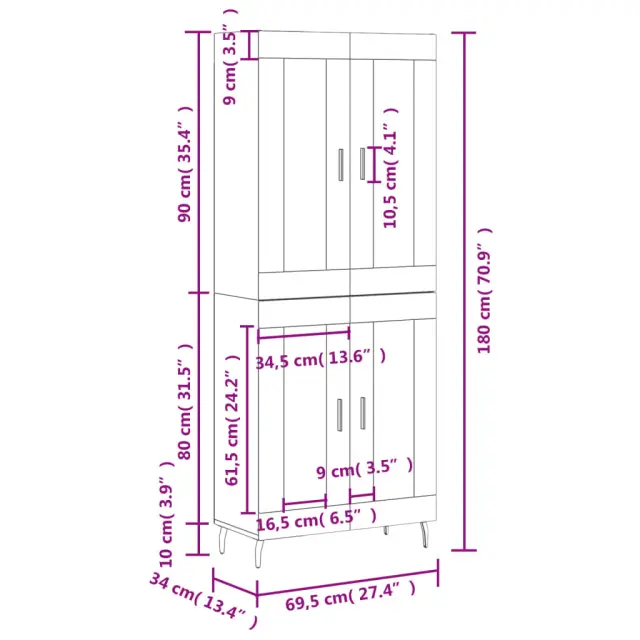 Ali iščete stilsko visoko omaro? Ta visoka komoda doda eleganten čar vašim notranjim prostorom! Vzdržljiv material: Inženirski les se ponaša z izjemno kakovostjo, gladko površino ter močjo, stabilnostjo in odpornostjo na vlago.Veliko prostora za shranjevanje: Omarica ponuja veliko prostora za shranjevanje različnih dnevnih potrebščin, da bodo lepo organizirane in na dosegu roke.Praktična vrata: Poskrbite, da bo vaš prostor urejen, tako da majhne stvari skrijete za vrata omare za shranjevanje.Železne noge: Železne noge dodajo vašim notranjim prostorom umirjen slog, hkrati pa zagotavljajo stabilnost. Opozorilo:Za preprečitev prevračanja je treba ta izdelek uporabiti s priloženo napravo za pritrditev na steno. Dobro je vedeti:Vijaki in čepi za notranjost stene niso priloženi. Svetujemo vam, da poiščete in uporabite vijake in zatiče, ki so primerni za vaše stene. Če niste prepričani, se lahko posvetujete s strokovnjakom. Preberite in upoštevajte vse korake v navodilih.Barva: BelaMaterial: Inženirski les, železo, stekloSkupne dimenzije: 69,5 x 34 x 180 cm (Š x G x V)Dimenzije kredence: 69,5 x 34 x 90 cm (Š x G x V)Mere zgornje plošče: 69,5 x 34 x 90 cm (Š x G x V)Potrebno sestavljanje: DaPaket vsebuje:1 x Komoda1 x Zgornja omaricaLegal Documents:Več informacij o tem, kako preprečiti prevračanje pohištva, je na voljo tukaj 3199633