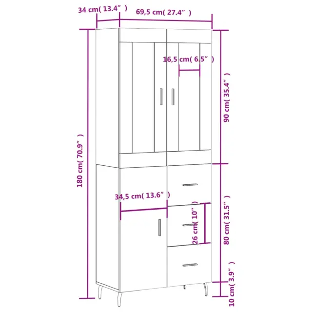 Ali iščete stilsko visoko omaro? Ta visoka komoda doda eleganten čar vašim notranjim prostorom! Vzdržljiv material: Inženirski les se ponaša z izjemno kakovostjo, gladko površino ter močjo, stabilnostjo in odpornostjo na vlago.Veliko prostora za shranjevanje: Omarica ponuja veliko prostora za shranjevanje različnih dnevnih potrebščin, da bodo lepo organizirane in na dosegu roke.Praktična vrata: Poskrbite, da bo vaš prostor urejen, tako da majhne stvari skrijete za vrata omare za shranjevanje.Kovinske noge: Kovinske noge dodajo vaši notranjosti umirjen slog, hkrati pa zagotavljajo stabilnost. Opozorilo:Za preprečitev prevračanja je treba ta izdelek uporabiti s priloženo napravo za pritrditev na steno. Dobro je vedeti:Vijaki in čepi za notranjost stene niso priloženi. Svetujemo vam, da poiščete in uporabite vijake in zatiče, ki so primerni za vaše stene. Če niste prepričani, se lahko posvetujete s strokovnjakom. Preberite in upoštevajte vse korake v navodilih.Barva: BelaMaterial: Inženirski les, kovinaSkupne dimenzije: 69,5 x 34 x 180 cm (Š x G x V)Dimenzije kredence: 69,5 x 34 x 90 cm (Š x G x V)Mere zgornje plošče: 69,5 x 34 x 90 cm (Š x G x V)Potrebno sestavljanje: DaPaket vsebuje:1 x Komoda1 x Zgornja omaricaLegal Documents:Več informacij o tem, kako preprečiti prevračanje pohištva, je na voljo tukaj 3199825
