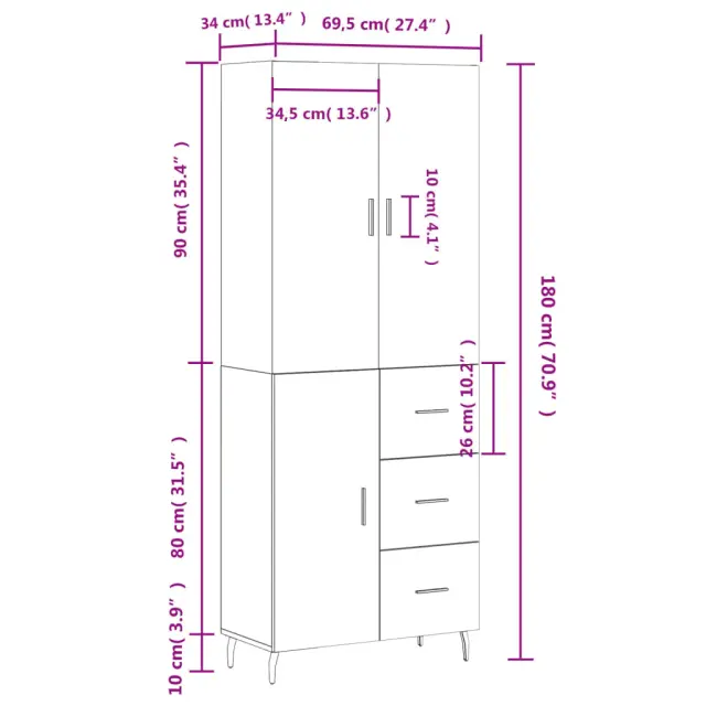 Ali iščete stilsko visoko omaro? Ta visoka komoda doda eleganten čar vašim notranjim prostorom! Vzdržljiv material: Inženirski les se ponaša z izjemno kakovostjo, gladko površino ter močjo, stabilnostjo in odpornostjo na vlago.Veliko prostora za shranjevanje: Omarica ponuja veliko prostora za shranjevanje različnih dnevnih potrebščin, da bodo lepo organizirane in na dosegu roke.Praktična vrata: Poskrbite, da bo vaš prostor urejen, tako da majhne stvari skrijete za vrata omare za shranjevanje.Kovinske noge: Kovinske noge dodajo vaši notranjosti umirjen slog, hkrati pa zagotavljajo stabilnost. Opozorilo:Za preprečitev prevračanja je treba ta izdelek uporabiti s priloženo napravo za pritrditev na steno. Dobro je vedeti:Vijaki in čepi za notranjost stene niso priloženi. Svetujemo vam, da poiščete in uporabite vijake in zatiče, ki so primerni za vaše stene. Če niste prepričani, se lahko posvetujete s strokovnjakom. Preberite in upoštevajte vse korake v navodilih.Barva: BelaMaterial: Inženirski les, kovinaSkupne dimenzije: 69,5 x 34 x 180 cm (Š x G x V)Dimenzije kredence: 69,5 x 34 x 90 cm (Š x G x V)Mere zgornje plošče: 69,5 x 34 x 90 cm (Š x G x V)Potrebno sestavljanje: DaPaket vsebuje:1 x Komoda1 x Zgornja omaricaLegal Documents:Več informacij o tem, kako preprečiti prevračanje pohištva, je na voljo tukaj 3195915