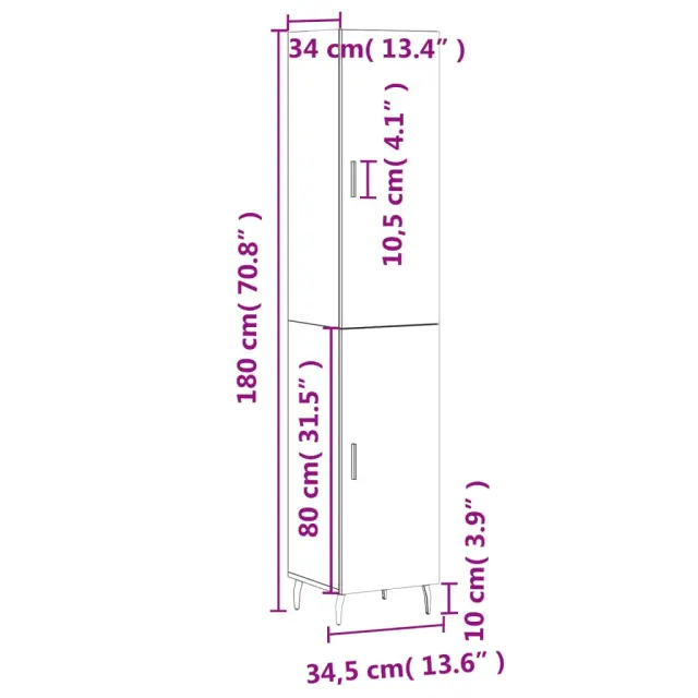Ali iščete stilsko visoko omaro? Ta visoka komoda doda eleganten čar vašim notranjim prostorom! Vzdržljiv material: Inženirski les se ponaša z izjemno kakovostjo, gladko površino ter močjo, stabilnostjo in odpornostjo na vlago.Veliko prostora za shranjevanje: Omarica ponuja veliko prostora za shranjevanje različnih dnevnih potrebščin, da bodo lepo organizirane in na dosegu roke.Praktična vrata: Poskrbite, da bo vaš prostor brez nereda, tako da majhne stvari skrijete za vrata omare za shranjevanje.Kovinske noge: Kovinske noge dodajo vaši notranjosti umirjen slog, hkrati pa zagotavljajo stabilnost. Opozorilo:Za preprečitev prevračanja je treba ta izdelek uporabiti s priloženo napravo za pritrditev na steno. Dobro je vedeti:Vijaki in čepi za notranjost stene niso priloženi. Svetujemo vam, da poiščete in uporabite vijake in zatiče, ki so primerni za vaše stene. Če niste prepričani, se lahko posvetujete s strokovnjakom. Preberite in upoštevajte vse korake v navodilih.Barva: Dimljeni hrastMaterial: Inženirski les, kovinaSkupne dimenzije: 34,5 x 34 x 180 cm (Š x G x V)Mere omarice: 34,5 x 34 x 90 cm (Š x G x V)Mere zgornje enote visoke omare: 34,5 x 34 x 90 cm (Š x G x V)Potrebno sestavljanje: DaPaket vsebuje:1 x Komoda1 x Zgornja omaricaLegal Documents:Več informacij o tem, kako preprečiti prevračanje pohištva, je na voljo tukaj 3198806