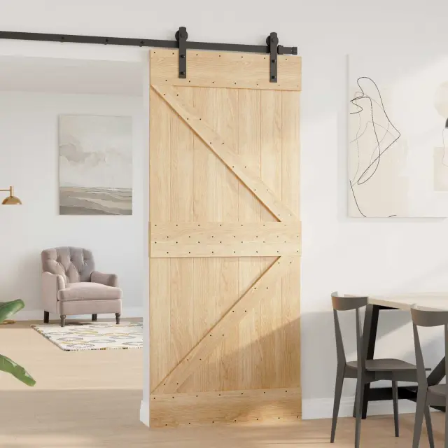 Ta vrata iz masivnega borovega lesa dodajajo sodoben pridih s svojim preprostim in funkcionalnim dizajnom, ki ga zaznamujejo čiste linije in minimalističen slog. Narejena iz neobdelanega bora, izžarevajo naravno lepoto in dodajajo toplino notranjosti.