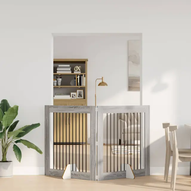Ta kovinska pasja ograja je enostavna in moderna, odlična za upravljanje prostora ter vašim ljubljenčkom nudi varno okolje. Oblika ji omogoča, da se lepo prilega v kote ali ob steno, kar pomeni, da je vsestranska izbira za hišne ljubljenčke v urbanih okoljih.