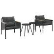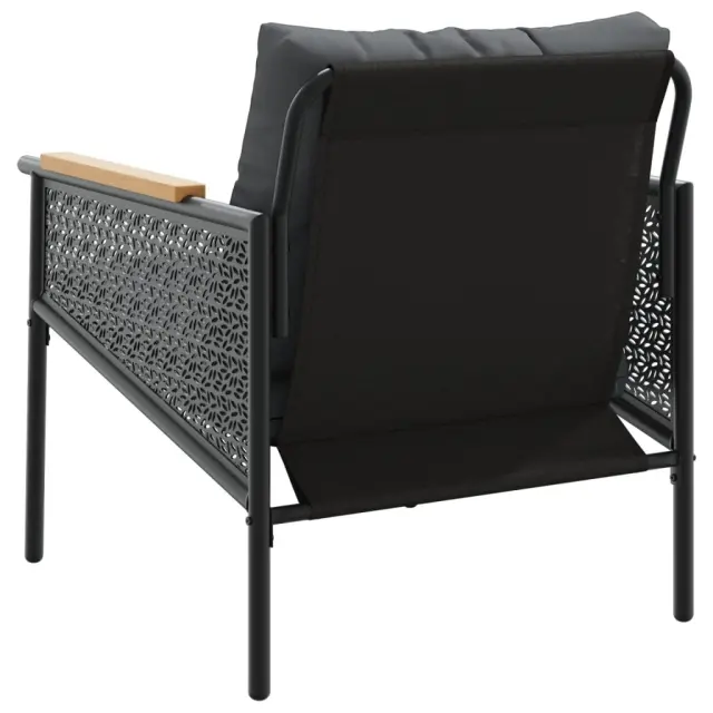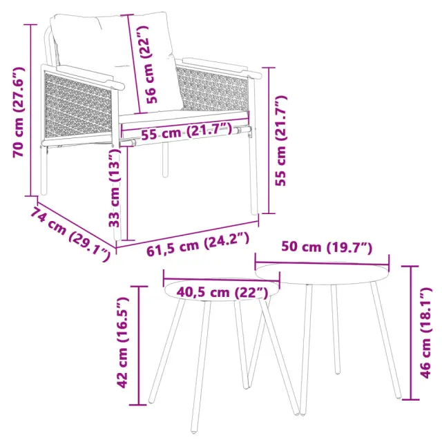 Ta vrtna balkonska garnitura je popoln dodatek za vaše dvorišče, teraso ali verando, saj zagotavlja udoben in privlačen prostor za klepet z družino in prijatelji ali preprosto za sprostitev in uživanje na prostem. Trpežno in dolgotrajno: Zaradi svoje trajnosti, odpornosti na vodo in bledenje, enostavnega vzdrževanja ter zaščite pred UV žarki in plesnijo je tkanina iz tekstilena idealna izbira za zunanje pohištvo in konstrukcije za zagotavljanje sence.Udobno sedenje: To zunanje pohištvo z debelo oblazinjenimi blazinami zagotavlja udobno sedenje.Robustna mizna plošča: Miza te zunanje vrtne garniture ima trpežno ploščo, ki je idealna za odlaganje pijače ali drugih potrebščin, ki jih potrebujete na dosegu roke.Prevleko je mogoče odstraniti in oprati: Te sedežne blazine imajo odstranljive prevleke za lažje pranje in vzdrževanje.Robusten in stabilen okvir: Prašno premazan jeklen okvir zagotavlja, da je vrtno pohištvo močno in stabilno za vsakodnevno uporabo na prostem. Dobro je vedeti:Če želite, da vaše zunanje pohištvo ostane lepo, vam priporočamo, da ga zaščitite z vodoodporno prevleko.Stol:Barva: ČrnaMaterial: Prašno lakirano jeklo, tekstilen, trdna tikovinaDimenzije: 61,5 x 74 x 70 cm (Š x G x V)Velikost sedeža: 55 x 60 cm (Š x G)Višina sedeža, merjena od tal: 33 cmVišina naslonjal za roke od tal: 55 cmMaksimalna nosilnost (na sedež): 110 kgMiza:Barva: ČrnaMaterial: Jeklo s prašnim premazomDimenzije klubske mizice (L): 50 x 46 cm (premer x V)Dimenzije klubske mizice (S): 40,5 x 42 cm (premer x V)Blazina:Barva: AntracitnaMaterial prevleke: Tkanina (100 % poliester)Polnilo sedežne blazine: PenaPolnilo hrbtne blazine: PP bombažDimenzije blazine za sedež: 55 x 58 x 5 cm (Š x G x D)Dimenzije hrbtne blazine: 58 x 56 x 13 cm (D x Š x D)Potrebno sestavljanje: DaPaket vsebuje:2 x Vrtni stol2 x Klubska mizica2 x Blazina za hrbet2 x Sedežna blazina s snemljivo pralno prevleko 4009302