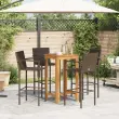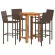 Ta vrtna barska garnitura z elegantnim in sodobnim dizajnom bo odlična izbira za jedilnico ali sprostitev na vrtu. Trpežen material: PE ratan, znan tudi kot poli ratan, je močan sintetični material, ki ne potrebuje vzdrževanja in je videti kot naravni ratan. Je lahek, enostaven za čiščenje in se zaradi svoje vzdržljivosti in odpornosti na vremenske vplive pogosto uporablja za zunanje pohištvo. Ti barski stoli so izdelani iz lahkega ratana PE, so trpežni in enostavni za premikanje. Trdna mizna plošča: Trden akacijev les je čudovit naraven material. Akacijev les je tropski trden les, ki je gost, močan in vzdržljiv. Ta barska miza je izdelana iz trdnega akacijevega lesa, zato je trdna in stabilna. Nanjo lahko odložite svoje prigrizke, pijačo in vse svoje najljubše okrasne predmete. Udobna izkušnja sedenja: Vgrajeni podstavki za noge zagotavljajo dodatno udobje pri sedenju na stolčku. Dobro je vedeti:Če želite, da vaše zunanje pohištvo ostane lepo, vam priporočamo, da ga zaščitite z vodoodporno prevleko.Barska miza:Material: Trden akacijev les z oljnim premazomDimenzije: 60 x 60 x 105 cm (D x Š x V)Barski stol:Barva: RjavaMaterial: PE ratan, jeklen okvir s prašnim premazomDimenzije: 52 x 56 x 118 cm (Š x G x V)Velikost sedeža: 46 x 46 cm (Š x G)Višina sedeža, merjena od tal: 80 cmVišina naslonjala za noge, merjena od tal: 33 cmPotrebno sestavljanje: DaPaket vsebuje:1 x Barska miza4 x Barski stolček 3295275