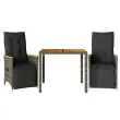 S to udobno bistro garnituro lahko z družino in prijatelji uživate v kavi ali klepetu na vrtu, dvorišču ali balkonu. Vzdržljiv material: PE ratan, znan tudi kot poli ratan, je močan sintetični material, ki zahteva malo vzdrževanja in je videti kot naravni ratan. Je lahek, enostaven za čiščenje in se zaradi svoje vzdržljivosti in odpornosti na vremenske vplive pogosto uporablja za zunanje pohištvo.Nastavljivo naslonjalo za hrbet in noge: Ta vrtni sedež ima ročaj. Naslonjalo za hrbet in naslonjalo za noge lahko s potegom ročaja nastavite v poljuben položaj in ju hitro vrnete v prvotni položaj.Udobno sedenje: To zunanje pohištvo z debelo oblazinjenimi blazinami zagotavlja udobno sedenje.Prevleko je mogoče odstraniti in oprati: Te sedežne blazine imajo odstranljive prevleke za lažje pranje in vzdrževanje. Hrbtne blazine imajo na zadnji strani zavihek za enostavno pritrditev na naslonjala.Stabilna mizna plošča, ki je enostavna za čiščenje: Ta vrtna miza ima ploščo iz akacijevega lesa, ki je čvrsta, vzdržljiva in jo je enostavno čistiti z vlažno krpo. Dobro je vedeti:Če želite, da vaše zunanje pohištvo ostane lepo, vam priporočamo, da ga zaščitite z vodoodporno prevleko.UV-odpornoPotrebno sestavljanje: DaStol z naslonjalom:Barva: SivaMaterial: PE ratan, prašno premazano jeklo, trden akacijev les z oljnim premazomDimenzije v sedečem položaju: 56 x 59 x 92 cm (Š x G x V)Dimenzije v ležečem položaju: 56 x 83 x 85 cm (Š x G x V)Velikost sedišča: 49 x 50,5 cm (Š × G)Višina sedeža od tal: 44 cmVišina naslonjala za roke, merjena od tal: 63 cmMaksimalna nosilnost (na sedež): 110 kgMiza:Barva: SivaMaterial: PE ratan, jeklo, trden akacijev les z oljnim premazomDimenzije: 90 x 90 x 75 cm (D x Š x V)Blazina:Barva: Temno sivaMaterial prevleke: Tkanina (100 % poliester)Polnilo sedežne blazine: PenaPolnilo hrbtne blazine: bombažna vlaknaDimenzije sedežne blazine: 49 x 90 x 3 cm (Š x G x D)Dimenzije hrbtne blazine: 70 x 49 x 10 cm (D x Š x D) Paket vsebuje:2 x Vrtni stol s funkcijo nagiba2 x Sedežna blazina s snemljivo pralno prevleko2 x Blazina za hrbet1 x Vrtna miza 3276967
