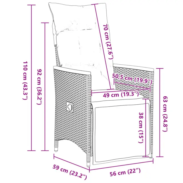 S to udobno bistro garnituro lahko z družino in prijatelji uživate v kavi ali klepetu na vrtu, dvorišču ali balkonu. Vzdržljiv material: PE ratan, znan tudi kot poli ratan, je močan sintetični material, ki zahteva malo vzdrževanja in je videti kot naravni ratan. Je lahek, enostaven za čiščenje in se zaradi svoje vzdržljivosti in odpornosti na vremenske vplive pogosto uporablja za zunanje pohištvo.Nastavljivo naslonjalo za hrbet in noge: Ta vrtni sedež ima ročaj. Naslonjalo za hrbet in naslonjalo za noge lahko s potegom ročaja nastavite v poljuben položaj in ju hitro vrnete v prvotni položaj.Udobno sedenje: To zunanje pohištvo z debelo oblazinjenimi blazinami zagotavlja udobno sedenje.Prevleko je mogoče odstraniti in oprati: Te sedežne blazine imajo odstranljive prevleke za lažje pranje in vzdrževanje. Hrbtne blazine imajo na zadnji strani zavihek za enostavno pritrditev na naslonjala.Stabilna mizna plošča, ki je enostavna za čiščenje: Ta vrtna miza ima ploščo iz akacijevega lesa, ki je čvrsta, vzdržljiva in jo je enostavno čistiti z vlažno krpo. Dobro je vedeti:Če želite, da vaše zunanje pohištvo ostane lepo, vam priporočamo, da ga zaščitite z vodoodporno prevleko.UV-odpornoPotrebno sestavljanje: DaStol z naslonjalom:Barva: ČrnaMaterial: PE ratan, prašno premazano jeklo, trden akacijev les z oljnim premazomDimenzije v sedečem položaju: 56 x 59 x 92 cm (Š x G x V)Dimenzije v ležečem položaju: 56 x 83 x 85 cm (Š x G x V)Velikost sedišča: 49 x 50,5 cm (Š × G)Višina sedeža od tal: 44 cmVišina naslonjala za roke, merjena od tal: 63 cmMaksimalna nosilnost (na sedež): 110 kgMiza:Barva: ČrnaMaterial: PE ratan, jeklo, trden akacijev les z oljnim premazomDimenzije: 190 x 90 x 75 cm (D x Š x V)Blazina:Barva: Kremno belaMaterial prevleke: Tkanina (100 % poliester)Polnilo sedežne blazine: PenaPolnilo hrbtne blazine: bombažna vlaknaDimenzije sedežne blazine: 49 x 90 x 3 cm (Š x G x D)Dimenzije hrbtne blazine: 70 x 49 x 10 cm (D x Š x D) Paket vsebuje:6 x Vrtni stol s funkcijo nagiba6 x Sedežna blazina s snemljivo pralno prevleko6 x Blazina za hrbet1 x Vrtna miza 3276963