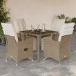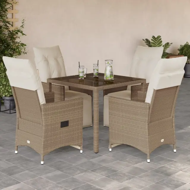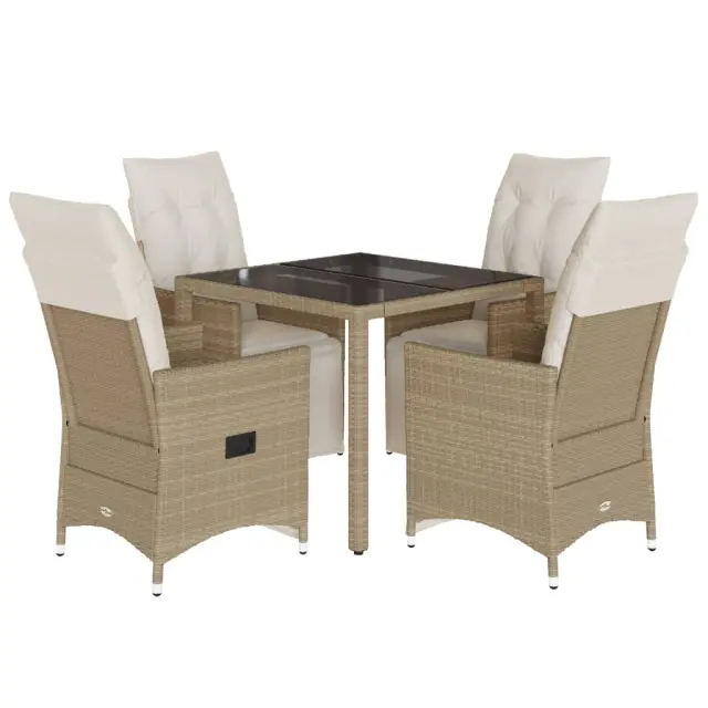 S to udobno bistro garnituro lahko z družino in prijatelji uživate v kavi ali klepetu na vrtu, dvorišču ali balkonu. Vzdržljiv material: PE ratan, znan tudi kot poli ratan, je močan sintetični material, ki zahteva malo vzdrževanja in je videti kot naravni ratan. Je lahek, enostaven za čiščenje in se zaradi svoje vzdržljivosti in odpornosti na vremenske vplive pogosto uporablja za zunanje pohištvo.Nastavljivo naslonjalo za hrbet in noge: Ta vrtni sedež ima ročaj. Naslonjalo za hrbet in naslonjalo za noge lahko s potegom ročaja nastavite v poljuben položaj in ju hitro vrnete v prvotni položaj.Udobno sedenje: To zunanje pohištvo z debelo oblazinjenimi blazinami zagotavlja udobno sedenje.Prevleko je mogoče odstraniti in oprati: Te sedežne blazine imajo odstranljive prevleke za lažje pranje in vzdrževanje. Hrbtne blazine imajo na zadnji strani zavihek za enostavno pritrditev na naslonjala.Steklena mizna plošča: Površina zunanje mize je izdelana iz močnega in trpežnega kaljenega stekla, kar omogoča enostavno čiščenje z vlažno krpo in vašemu zunanjemu prostoru doda pridih elegance. Dobro je vedeti:Če želite, da vaše zunanje pohištvo ostane lepo, vam priporočamo, da ga zaščitite z vodoodporno prevleko.UV-odpornoPotrebno sestavljanje: DaStol z naslonjalom:Barva: BežMaterial: PE ratan, jeklen okvir s prašnim premazomDimenzije v sedečem položaju: 56 x 59 x 92 cm (Š x G x V)Dimenzije v ležečem položaju: 56 x 83 x 85 cm (Š x G x V)Velikost sedišča: 49 x 50,5 cm (Š × G)Višina sedeža od tal: 44 cmVišina naslonjala za roke, merjena od tal: 63 cmMaksimalna nosilnost (na sedež): 110 kgMiza:Barva: BežMaterial: PE ratan, jeklo s prašnim premazom, kaljeno stekloDimenzije: 90 x 90 x 75 cm (D x Š x V)Blazina:Barva: Kremno belaMaterial prevleke: Tkanina (100 % poliester)Polnilo sedežne blazine: PenaPolnilo hrbtne blazine: bombažna vlaknaDimenzije sedežne blazine: 49 x 90 x 3 cm (Š x G x D)Dimenzije hrbtne blazine: 70 x 49 x 10 cm (D x Š x D) Paket vsebuje:4 x Vrtni stol s funkcijo nagiba4 x Sedežna blazina s snemljivo in pralno prevleko4 x Blazina za hrbet1 x Vrtna miza 3276938