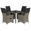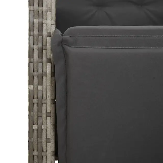 S to udobno bistro garnituro lahko z družino in prijatelji uživate v kavi ali klepetu na vrtu, dvorišču ali balkonu. Vzdržljiv material: PE ratan, znan tudi kot poli ratan, je močan sintetični material, ki zahteva malo vzdrževanja in je videti kot naravni ratan. Je lahek, enostaven za čiščenje in se zaradi svoje vzdržljivosti in odpornosti na vremenske vplive pogosto uporablja za zunanje pohištvo.Nastavljivo naslonjalo za hrbet in noge: Ta vrtni sedež ima ročaj. Naslonjalo za hrbet in naslonjalo za noge lahko s potegom ročaja nastavite v poljuben položaj in ju hitro vrnete v prvotni položaj.Udobno sedenje: To zunanje pohištvo z debelo oblazinjenimi blazinami zagotavlja udobno sedenje.Prevleko je mogoče odstraniti in oprati: Te sedežne blazine imajo odstranljive prevleke za lažje pranje in vzdrževanje. Hrbtne blazine imajo na zadnji strani zavihek za enostavno pritrditev na naslonjala.Steklena mizna plošča: Površina zunanje mize je izdelana iz močnega in trpežnega kaljenega stekla, kar omogoča enostavno čiščenje z vlažno krpo in vašemu zunanjemu prostoru doda pridih elegance. Dobro je vedeti:Če želite, da vaše zunanje pohištvo ostane lepo, vam priporočamo, da ga zaščitite z vodoodporno prevleko.UV-odpornoPotrebno sestavljanje: DaStol z naslonjalom:Barva: SivaMaterial: PE ratan, jeklen okvir s prašnim premazomDimenzije v sedečem položaju: 56 x 59 x 92 cm (Š x G x V)Dimenzije v ležečem položaju: 56 x 83 x 85 cm (Š x G x V)Velikost sedišča: 49 x 50,5 cm (Š × G)Višina sedeža od tal: 44 cmVišina naslonjala za roke, merjena od tal: 63 cmMaksimalna nosilnost (na sedež): 110 kgMiza:Barva: SivaMaterial: PE ratan, jeklo s prašnim premazom, kaljeno stekloDimenzije: 90 x 90 x 75 cm (D x Š x V)Blazina:Barva: Temno sivaMaterial prevleke: Tkanina (100 % poliester)Polnilo sedežne blazine: PenaPolnilo hrbtne blazine: bombažna vlaknaDimenzije sedežne blazine: 49 x 90 x 3 cm (Š x G x D)Dimenzije hrbtne blazine: 70 x 49 x 10 cm (D x Š x D) Paket vsebuje:4 x Vrtni stol s funkcijo nagiba4 x Sedežna blazina s snemljivo in pralno prevleko4 x Blazina za hrbet1 x Vrtna miza 3276894