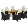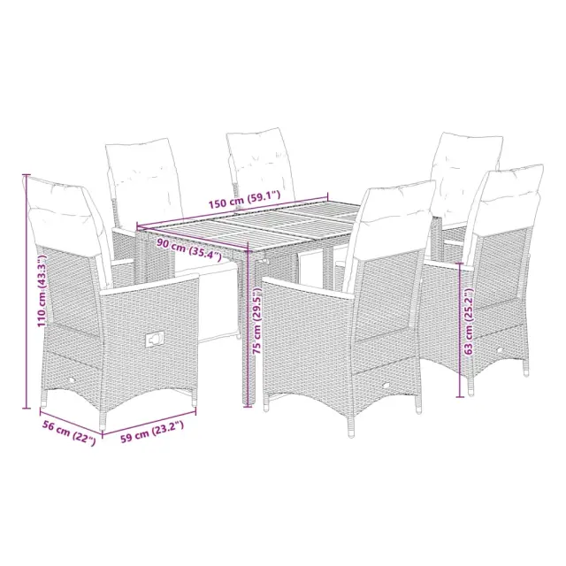 S to udobno bistro garnituro lahko z družino in prijatelji uživate v kavi ali klepetu na vrtu, dvorišču ali balkonu. Vzdržljiv material: PE ratan, znan tudi kot poli ratan, je močan sintetični material, ki zahteva malo vzdrževanja in je videti kot naravni ratan. Je lahek, enostaven za čiščenje in se zaradi svoje vzdržljivosti in odpornosti na vremenske vplive pogosto uporablja za zunanje pohištvo.Nastavljivo naslonjalo za hrbet in noge: Ta vrtni sedež ima ročaj. Naslonjalo za hrbet in naslonjalo za noge lahko s potegom ročaja nastavite v poljuben položaj in ju hitro vrnete v prvotni položaj.Udobno sedenje: To zunanje pohištvo z debelo oblazinjenimi blazinami zagotavlja udobno sedenje.Prevleko je mogoče odstraniti in oprati: Te sedežne blazine imajo odstranljive prevleke za lažje pranje in vzdrževanje. Hrbtne blazine imajo na zadnji strani zavihek za enostavno pritrditev na naslonjala.Stabilna mizna plošča, ki je enostavna za čiščenje: Ta vrtna miza ima ploščo iz akacijevega lesa, ki je čvrsta, vzdržljiva in jo je enostavno čistiti z vlažno krpo. Dobro je vedeti:Če želite, da vaše zunanje pohištvo ostane lepo, vam priporočamo, da ga zaščitite z vodoodporno prevleko.UV-odpornoPotrebno sestavljanje: DaStol z naslonjalom:Barva: ČrnaMaterial: PE ratan, prašno premazano jeklo, trden akacijev les z oljnim premazomDimenzije v sedečem položaju: 56 x 59 x 92 cm (Š x G x V)Dimenzije v ležečem položaju: 56 x 83 x 85 cm (Š x G x V)Velikost sedišča: 49 x 50,5 cm (Š × G)Višina sedeža od tal: 44 cmVišina naslonjala za roke, merjena od tal: 63 cmMaksimalna nosilnost (na sedež): 110 kgMiza:Barva: ČrnaMaterial: PE ratan, jeklo, trden akacijev les z oljnim premazomDimenzije: 150 x 90 x 75 cm (D x Š x V)Blazina:Barva: Kremno belaMaterial prevleke: Tkanina (100 % poliester)Polnilo sedežne blazine: PenaPolnilo hrbtne blazine: bombažna vlaknaDimenzije sedežne blazine: 49 x 90 x 3 cm (Š x G x D)Dimenzije hrbtne blazine: 70 x 49 x 10 cm (D x Š x D) Paket vsebuje:6 x Vrtni stol s funkcijo nagiba6 x Sedežna blazina s snemljivo pralno prevleko6 x Blazina za hrbet1 x Vrtna miza 3276962