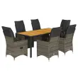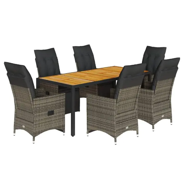 S to udobno bistro garnituro lahko z družino in prijatelji uživate v kavi ali klepetu na vrtu, dvorišču ali balkonu. Vzdržljiv material: PE ratan, znan tudi kot poli ratan, je močan sintetični material, ki zahteva malo vzdrževanja in je videti kot naravni ratan. Je lahek, enostaven za čiščenje in se zaradi svoje vzdržljivosti in odpornosti na vremenske vplive pogosto uporablja za zunanje pohištvo.Nastavljivo naslonjalo za hrbet in noge: Ta vrtni sedež ima ročaj. Naslonjalo za hrbet in naslonjalo za noge lahko s potegom ročaja nastavite v poljuben položaj in ju hitro vrnete v prvotni položaj.Udobno sedenje: To zunanje pohištvo z debelo oblazinjenimi blazinami zagotavlja udobno sedenje.Prevleko je mogoče odstraniti in oprati: Te sedežne blazine imajo odstranljive prevleke za lažje pranje in vzdrževanje. Hrbtne blazine imajo na zadnji strani zavihek za enostavno pritrditev na naslonjala.Stabilna mizna plošča, ki je enostavna za čiščenje: Ta vrtna miza ima ploščo iz akacijevega lesa, ki je čvrsta, vzdržljiva in jo je enostavno čistiti z vlažno krpo. Dobro je vedeti:Če želite, da vaše zunanje pohištvo ostane lepo, vam priporočamo, da ga zaščitite z vodoodporno prevleko.UV-odpornoPotrebno sestavljanje: DaStol z naslonjalom:Barva: SivaMaterial: PE ratan, jeklen okvir s prašnim premazomDimenzije v sedečem položaju: 56 x 59 x 92 cm (Š x G x V)Dimenzije v ležečem položaju: 56 x 83 x 85 cm (Š x G x V)Velikost sedišča: 49 x 50,5 cm (Š × G)Višina sedeža od tal: 44 cmVišina naslonjala za roke, merjena od tal: 63 cmMaksimalna nosilnost (na sedež): 110 kgMiza:Barva: SivaMaterial: PE ratan, jeklo, trden akacijev les z oljnim premazomDimenzije: 190 x 90 x 75 cm (D x Š x V)Blazina:Barva: Temno sivaMaterial prevleke: Tkanina (100 % poliester)Polnilo sedežne blazine: PenaPolnilo hrbtne blazine: bombažna vlaknaDimenzije sedežne blazine: 49 x 90 x 3 cm (Š x G x D)Dimenzije hrbtne blazine: 70 x 49 x 10 cm (D x Š x D) Paket vsebuje:6 x Vrtni stol s funkcijo nagiba6 x Sedežna blazina s snemljivo pralno prevleko6 x Blazina za hrbet1 x Vrtna miza 3276889
