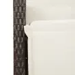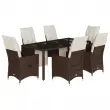 S to udobno bistro garnituro lahko z družino in prijatelji uživate v kavi ali klepetu na vrtu, dvorišču ali balkonu. Vzdržljiv material: PE ratan, znan tudi kot poli ratan, je močan sintetični material, ki zahteva malo vzdrževanja in je videti kot naravni ratan. Je lahek, enostaven za čiščenje in se zaradi svoje vzdržljivosti in odpornosti na vremenske vplive pogosto uporablja za zunanje pohištvo.Nastavljivo naslonjalo za hrbet in noge: Ta vrtni sedež ima ročaj. Naslonjalo za hrbet in naslonjalo za noge lahko s potegom ročaja nastavite v poljuben položaj in ju hitro vrnete v prvotni položaj.Udobno sedenje: To zunanje pohištvo z debelo oblazinjenimi blazinami zagotavlja udobno sedenje.Prevleko je mogoče odstraniti in oprati: Te sedežne blazine imajo odstranljive prevleke za lažje pranje in vzdrževanje. Hrbtne blazine imajo na zadnji strani zavihek za enostavno pritrditev na naslonjala.Steklena mizna plošča: Površina zunanje mize je izdelana iz močnega in trpežnega kaljenega stekla, kar omogoča enostavno čiščenje z vlažno krpo in vašemu zunanjemu prostoru doda pridih elegance. Dobro je vedeti:Če želite, da vaše zunanje pohištvo ostane lepo, vam priporočamo, da ga zaščitite z vodoodporno prevleko.UV-odpornoPotrebno sestavljanje: DaStol z naslonjalom:Barva: RjavaMaterial: PE ratan, jeklen okvir s prašnim premazomDimenzije v sedečem položaju: 56 x 59 x 92 cm (Š x G x V)Dimenzije v ležečem položaju: 56 x 83 x 85 cm (Š x G x V)Velikost sedišča: 49 x 50,5 cm (Š × G)Višina sedeža od tal: 44 cmVišina naslonjala za roke, merjena od tal: 63 cmMaksimalna nosilnost (na sedež): 110 kgMiza:Barva: RjavaMaterial: PE ratan, jeklo s prašnim premazom, kaljeno stekloDimenzije: 190 x 90 x 75 cm (D x Š x V)Blazina:Barva: Kremno belaMaterial prevleke: Tkanina (100 % poliester)Polnilo sedežne blazine: PenaPolnilo hrbtne blazine: bombažna vlaknaDimenzije sedežne blazine: 49 x 90 x 3 cm (Š x G x D)Dimenzije hrbtne blazine: 70 x 49 x 10 cm (D x Š x D)Paket vsebuje:6 x Vrtni stol s funkcijo nagiba6 x Sedežna blazina s snemljivo pralno prevleko6 x Blazina za hrbet1 x Vrtna miza 3276919