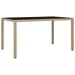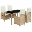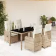 S to udobno bistro garnituro lahko z družino in prijatelji uživate v kavi ali klepetu na vrtu, dvorišču ali balkonu. Vzdržljiv material: PE ratan, znan tudi kot poli ratan, je močan sintetični material, ki zahteva malo vzdrževanja in je videti kot naravni ratan. Je lahek, enostaven za čiščenje in se zaradi svoje vzdržljivosti in odpornosti na vremenske vplive pogosto uporablja za zunanje pohištvo.Nastavljivo naslonjalo: Ta vrtni sedež ima ročaj. S potegom ročaja lahko naslonjalo nastavite v poljuben položaj in ga hitro vrnete v prvotni položaj.Udobno sedenje: To zunanje pohištvo z debelo oblazinjenimi blazinami zagotavlja udobno sedenje.Prevleko je mogoče odstraniti in oprati: Te sedežne blazine imajo odstranljive prevleke za lažje pranje in vzdrževanje. Hrbtne blazine imajo na zadnji strani zavihek za enostavno pritrditev na naslonjala.Steklena mizna plošča: Površina zunanje mize je izdelana iz močnega in trpežnega kaljenega stekla, kar omogoča enostavno čiščenje z vlažno krpo in vašemu zunanjemu prostoru doda pridih elegance. Dobro je vedeti:Če želite, da vaše zunanje pohištvo ostane lepo, vam priporočamo, da ga zaščitite z vodoodporno prevleko.UV-odpornoPotrebno sestavljanje: DaVrtni naslanjač:Barva: BežMaterial: PE ratan, jeklen okvir s prašnim premazomDimenzije v sedečem položaju: 54,5 x 58,5 x 92 cm (Š x G x V)Dimenzije v ležečem položaju: 54,5 x 81,5 x 83 cm (Š x G x V)Velikost sedeža: 47 x 48 cm (Š x G)Višina sedeža, merjena od tal: 43,5 cmVišina naslonjala za roke od tal: 65 cmMaksimalna nosilnost (na sedež): 110 kgMiza:Barva: BežMaterial: PE ratan, jeklo s prašnim premazom, kaljeno stekloDimenzije: 150 x 90 x 75 cm (D x Š x V)Blazina:Barva: Kremno belaMaterial prevleke: Tkanina (100 % poliester)Polnilo sedežne blazine: PenaPolnilo hrbtne blazine: bombažna vlaknaDimenzije sedežne blazine: 45/49 x 50 x 3 cm (Š x G x D)Dimenzije hrbtne blazine: 70 x 48 x 10 cm (D x Š x D) Paket vsebuje:4 x Vrtni stol s funkcijo nagiba4 x Sedežna blazina s snemljivo in pralno prevleko4 x Blazina za hrbet1 x Vrtna miza 3277098