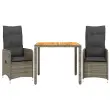 S to udobno bistro garnituro lahko z družino in prijatelji uživate v kavi ali klepetu na vrtu, dvorišču ali balkonu. Vzdržljiv material: PE ratan, znan tudi kot poli ratan, je močan sintetični material, ki zahteva malo vzdrževanja in je videti kot naravni ratan. Je lahek, enostaven za čiščenje in se zaradi svoje vzdržljivosti in odpornosti na vremenske vplive pogosto uporablja za zunanje pohištvo.Nastavljivo naslonjalo: Ta vrtni sedež ima ročaj. S potegom ročaja lahko naslonjalo nastavite v poljuben položaj in ga hitro vrnete v prvotni položaj.Udobno sedenje: To zunanje pohištvo z debelo oblazinjenimi blazinami zagotavlja udobno sedenje.Prevleko je mogoče odstraniti in oprati: Te sedežne blazine imajo odstranljive prevleke za lažje pranje in vzdrževanje. Hrbtne blazine imajo na zadnji strani zavihek za enostavno pritrditev na naslonjala.Stabilna mizna plošča, ki je enostavna za čiščenje: Ta vrtna miza ima ploščo iz akacijevega lesa, ki je čvrsta, vzdržljiva in jo je enostavno čistiti z vlažno krpo. Dobro je vedeti:Če želite, da vaše zunanje pohištvo ostane lepo, vam priporočamo, da ga zaščitite z vodoodporno prevleko.UV-odpornoPotrebno sestavljanje: DaVrtni naslanjač:Barva: SivaMaterial: PE ratan, jeklen okvir s prašnim premazomDimenzije v sedečem položaju: 54,5 x 58,5 x 92 cm (Š x G x V)Dimenzije v ležečem položaju: 54,5 x 81,5 x 83 cm (Š x G x V)Velikost sedeža: 47 x 48 cm (Š x G)Višina sedeža, merjena od tal: 43,5 cmVišina naslonjala za roke od tal: 65 cmMaksimalna nosilnost (na sedež): 110 kgMiza:Barva: SivaMaterial: PE ratan, jeklo, trden akacijev les z oljnim premazomDimenzije: 90 x 90 x 75 cm (D x Š x V)Blazina:Barva: Temno sivaMaterial prevleke: Tkanina (100 % poliester)Polnilo sedežne blazine: PenaPolnilo hrbtne blazine: bombažna vlaknaDimenzije sedežne blazine: 45/49 x 50 x 3 cm (Š x G x D)Dimenzije hrbtne blazine: 70 x 48 x 10 cm (D x Š x D) Paket vsebuje:2 x Vrtni stol s funkcijo nagiba2 x Sedežna blazina s snemljivo pralno prevleko2 x Blazina za hrbet1 x Vrtna miza 3277019