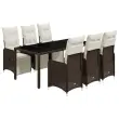 S to udobno bistro garnituro lahko z družino in prijatelji uživate v kavi ali klepetu na vrtu, dvorišču ali balkonu. Vzdržljiv material: PE ratan, znan tudi kot poli ratan, je močan sintetični material, ki zahteva malo vzdrževanja in je videti kot naravni ratan. Je lahek, enostaven za čiščenje in se zaradi svoje vzdržljivosti in odpornosti na vremenske vplive pogosto uporablja za zunanje pohištvo.Nastavljivo naslonjalo za hrbet in noge: Ta vrtni sedež ima ročaj. Naslonjalo za hrbet in naslonjalo za noge lahko s potegom ročaja nastavite v poljuben položaj in ju hitro vrnete v prvotni položaj.Udobno sedenje: To zunanje pohištvo z debelo oblazinjenimi blazinami zagotavlja udobno sedenje.Prevleko je mogoče odstraniti in oprati: Te sedežne blazine imajo odstranljive prevleke za lažje pranje in vzdrževanje. Hrbtne blazine imajo na zadnji strani zavihek za enostavno pritrditev na naslonjala.Steklena mizna plošča: Površina zunanje mize je izdelana iz močnega in trpežnega kaljenega stekla, kar omogoča enostavno čiščenje z vlažno krpo in vašemu zunanjemu prostoru doda pridih elegance. Dobro je vedeti:Če želite, da vaše zunanje pohištvo ostane lepo, vam priporočamo, da ga zaščitite z vodoodporno prevleko.UV-odpornoPotrebno sestavljanje: DaNastavljiv vrtni stol z oporo za noge:Barva: RjavaMaterial: PE ratan, jeklen okvir s prašnim premazomDimenzije v sedečem položaju: 54,5 x 58,5 x 92 cm (Š x G x V)Dimenzije v ležečem položaju: 54,5 x 111,5 x 83 cm (Š x G x V)Velikost sedeža: 47 x 48 cm (Š x G)Višina sedeža, merjena od tal: 43,5 cmVišina naslonjala za roke od tal: 65 cmMaksimalna nosilnost (na sedež): 110 kgMiza:Barva: RjavaMaterial: PE ratan, jeklo s prašnim premazom, kaljeno stekloDimenzije: 190 x 90 x 75 cm (D x Š x V)Blazina:Barva: Kremno belaMaterial prevleke: Tkanina (100 % poliester)Polnilo sedežne blazine: PenaPolnilo hrbtne blazine: bombažna vlaknaDimenzije sedežne blazine: 45/49 x 93 x 3 cm (Š x G x D)Dimenzije hrbtne blazine: 70 x 48 x 10 cm (D x Š x D) Paket vsebuje:6 x Nastavljiv vrtni stol z oporo za noge6 x Sedežna blazina s snemljivo pralno prevleko6 x Blazina za hrbet1 x Vrtna miza 3277191