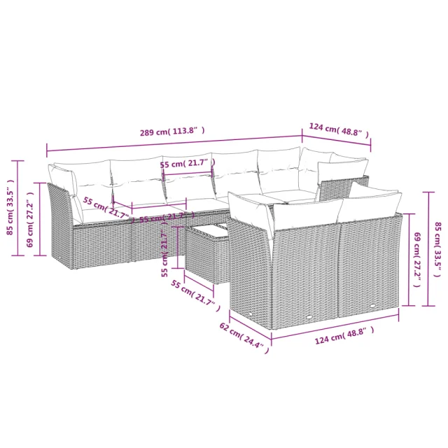 vidaXL Vrtna garnitura 9-delna z blazinami bež poli ratan